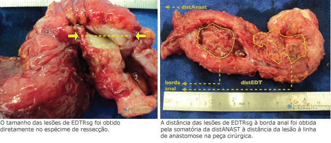 Resultados: sessenta e sete pacientes consecutivas com endometriose profunda (EP) foram submetidas à laparoscopia. Vinte pacientes, 32,5 ± 5,5 anos de idade (média ± desvio padrão), com 26 lesões de EDTRsg removidas cirurgicamente foram incluídas no estud. O tamanho (em cm) das lesões foi medido diretamente no espécime da ressecção. A distEDT e a distANAST em relação à BA foram medidas direta e/ou indiretamente por via transanal ou no espécime da ressecção (Figuras 1 e 2). Todos os procedimentos foram realizados pela mesma equipe cirúrgica.